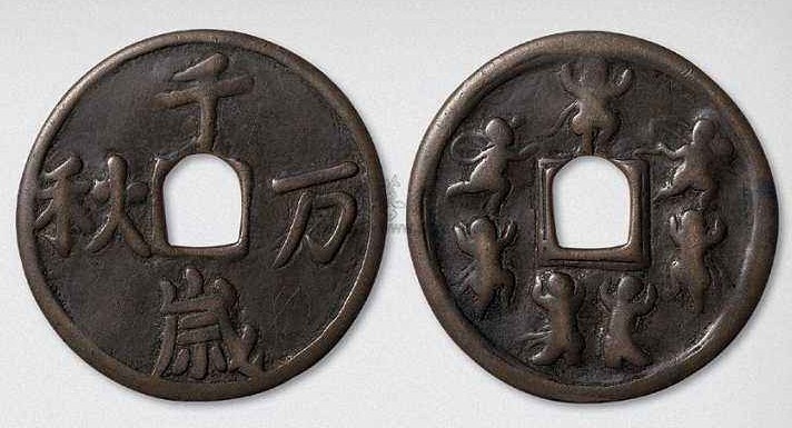 “千秋万岁”是成语,也是吉语,既体现着对某种事物流传永久的期待,又体现着对王朝千秋外代传的祝愿。早在汉代,大才子阮籍在其所作的《咏怀诗·十九》中就有“千秋万岁后,荣名安所之”。在现成的文物中,汉砖和南北朝石刻上均能看到“千秋万岁”的身影。而要说钱币上出现“千秋万岁”最早是在五代十国刘仁恭的铸币中,而集大成者则是辽代政权。