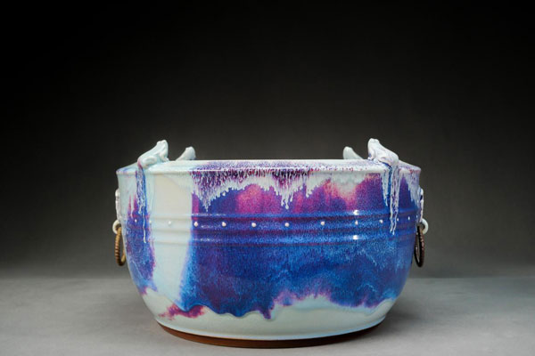 他擅长拉大件钧瓷,大画缸是他的拿手好戏。这一点,他说是在学习星航钧窑艺术总监刘红生的基础上,进行了提升和转化。刘宏举这次获得国家级大奖的作品《金蟾铺首大画缸》就是多年功力的集中体现。