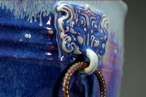 画缸上部两个神兽铺首,口衔活环,庄重威严,出神入化。围绕腹部的一圈鼓钉和旋纹,为作品增添了古意之美。最值得称道的是釉色,红蓝白相间,构成了一幅山水国画长卷,山川河流尽现。