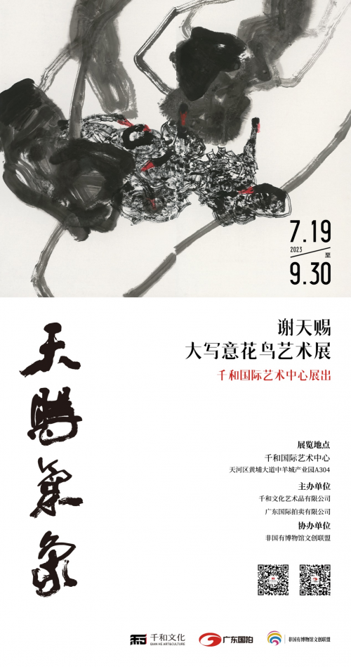 2023年7月19日下午,由广东千和文化艺术品有限公司与广东国际拍卖有限公司联合主办的“天赐气象——谢天赐大写意花鸟画艺术展”在千和国际艺术中心隆重开幕。本次展览是当代中国最具影响力的大写意花鸟画家谢天赐先生近年来创作的精品力作的集中展示,也是他对中国当代大写意花鸟画艺术发展的重要贡献。展览吸引了众多艺术界人士、收藏家、企业家、媒体和公众的关注和参与,现场气氛热烈。