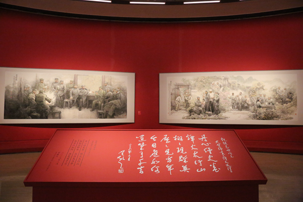 此次展览着重展出了大型组画《烽火太行》。2005年,赵志田先生为纪念抗战60周年,创作此画,2015年,他在原画的基础上重新构图增加内容、篇幅,最终于2019年底完成。《烽火太行》是巨幅历史组画,由鱼水情深、铜墙铁壁、共谋抗战、得道多助、正义之歌、普天同庆六个段落组成。为创作此画,赵志田先生多次深入太行老区收集资料,反复思考构图,多次修改。全画共刻画了260多个人物,画得形似而又传神。整幅作品宛如一部交响乐。赵志田先生怀揣着挥之不去的“太行情怀”,熔铸了抗日战争中牺牲的父辈给他留下的精神的影响,以及文革后多次深入太行引发的灵感的迹化,真实地表现了中华民族团结一致、不受屈辱、反抗侵略的民族精神,呼吁着现在社会更多的年轻人勿忘国耻、以史为鉴,要像先辈们学习,学习民族精神,做国家的脊梁。