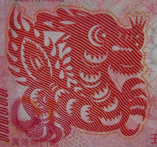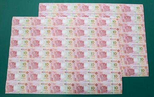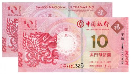 澳门双龙大炮筒整版钞采用香港顶级的防伪技术,大面积采用先进的SD凹版对印技术,凹版印刷、胶印对印图案、荧光显示检测及胶印凹印微缩文字技术,防伪安全线清晰可见,并且中藏专家组一一对应检验,以确保藏品万无一失。