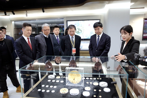讲解员为集团领导介绍奥林匹克题材贵金属纪念币